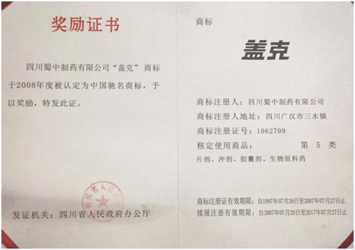 公司高度重视品牌战略,依法注册了“盖克”、“蜀中”、“三星堆”、“阿莫锋”、“益善源”、“蓉通”、“龙8唯一官方网站”等108件注册商标,1999年“盖克”、2003年“蜀中”、2007年“三星堆”被认定为德阳市知名商标,2001年“盖克”、2004年“蜀中”被认定为四川省著名商标, 2008年“盖克”商标被国家工商行政管理总局认定为“中国驰名商标”。2017年3月,公司盖克牌、龙8唯一官方网站牌阿莫西林胶囊和多酶片被四川省人民政府授予四川名牌产品称号。2016年,公司实现营业收入66373万元,利税7600万元;2017年,公司实现营业收入75045万元,利税7572万元。公司2017年被命名为德阳市第七批院士专家工作站,2016-2018连续三年被德阳市人民政府确定为重点龙头企业。